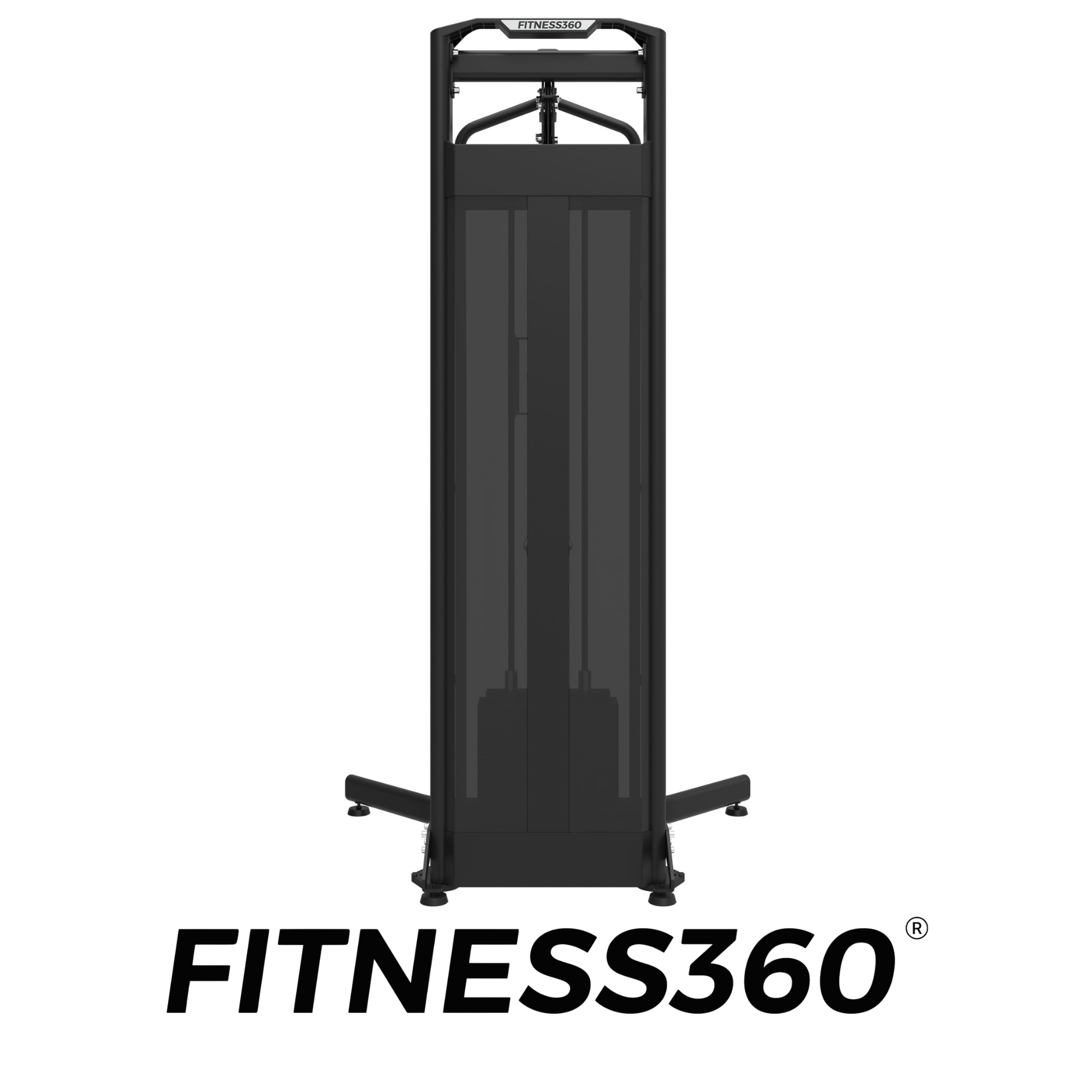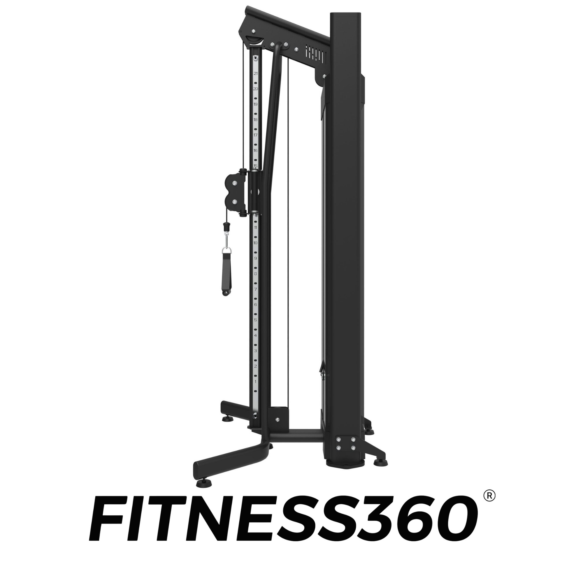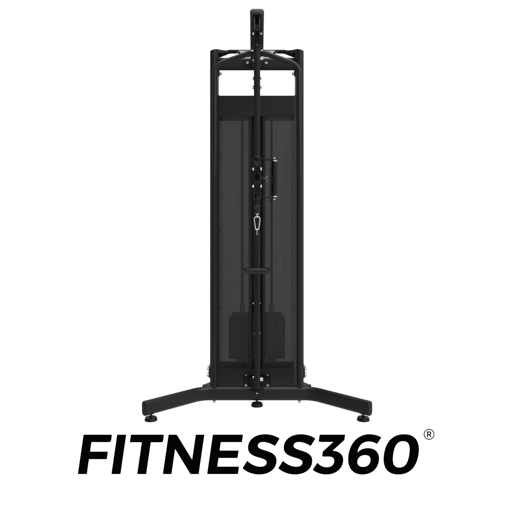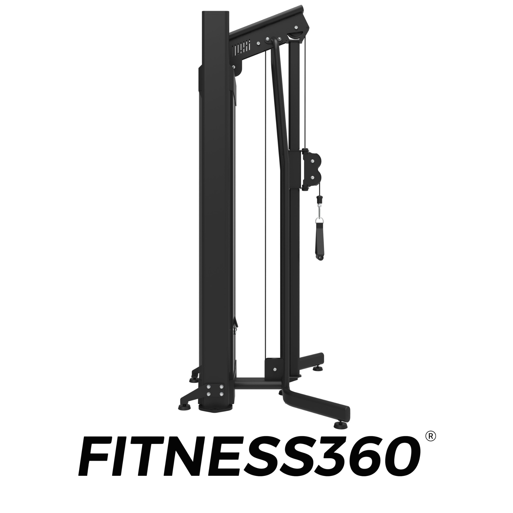 The frame uses solid steel construction with a laser-cut FITNESS360 logo on the weight magazine. Furthermore, all grips, pulleys, and adjustment points feature black or chrome finishes, reinforcing the clean and professional appearance that defines the FITNESS360 cable station series.
