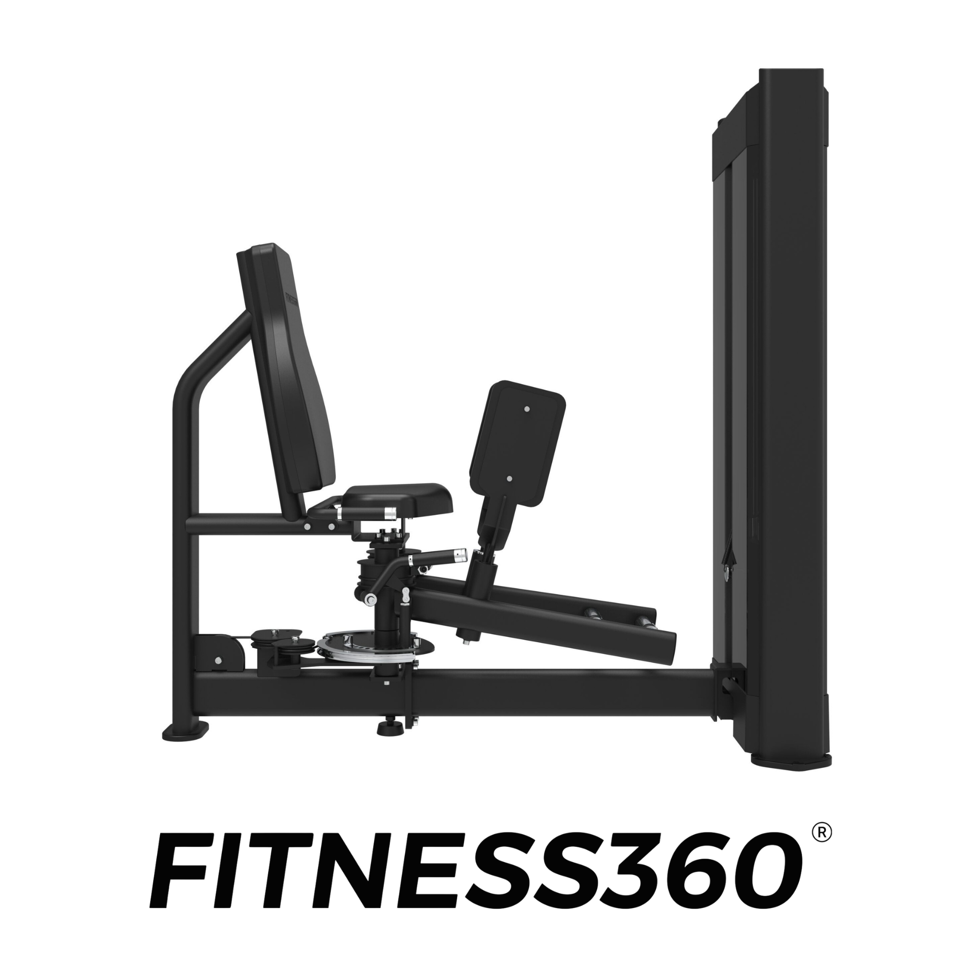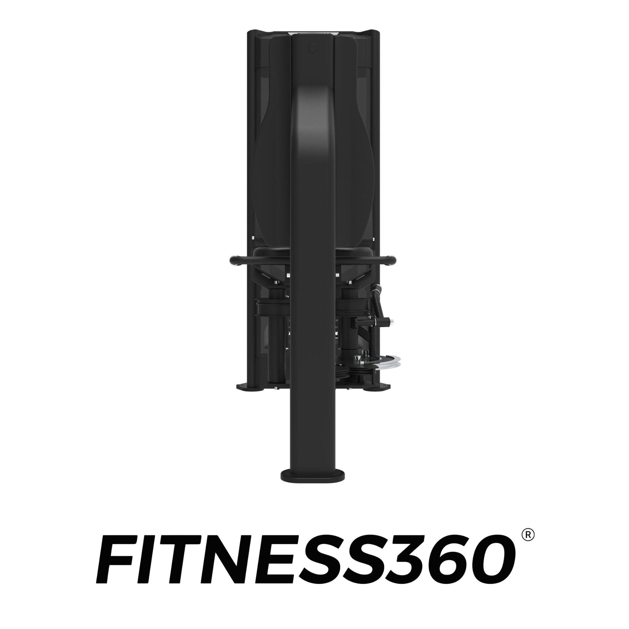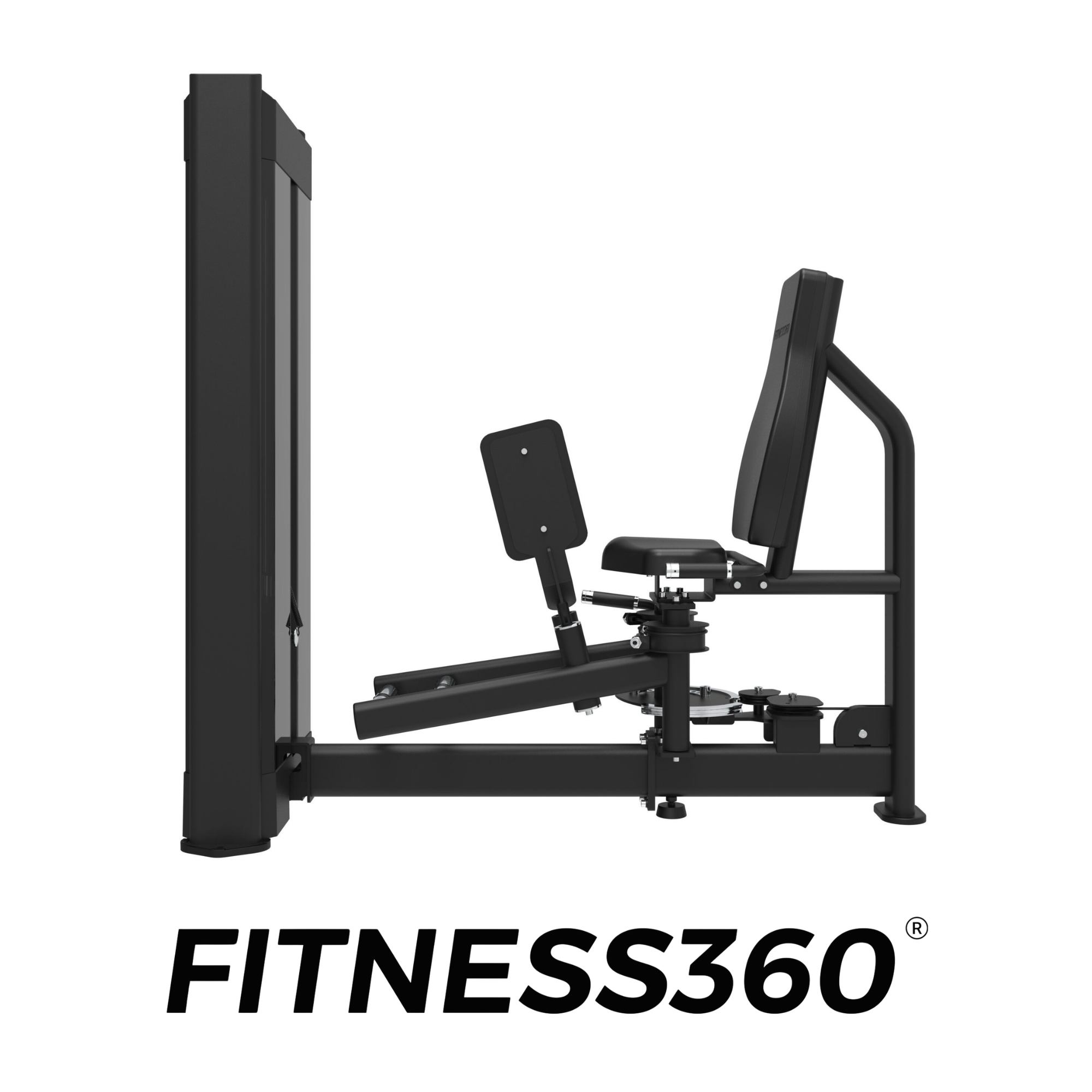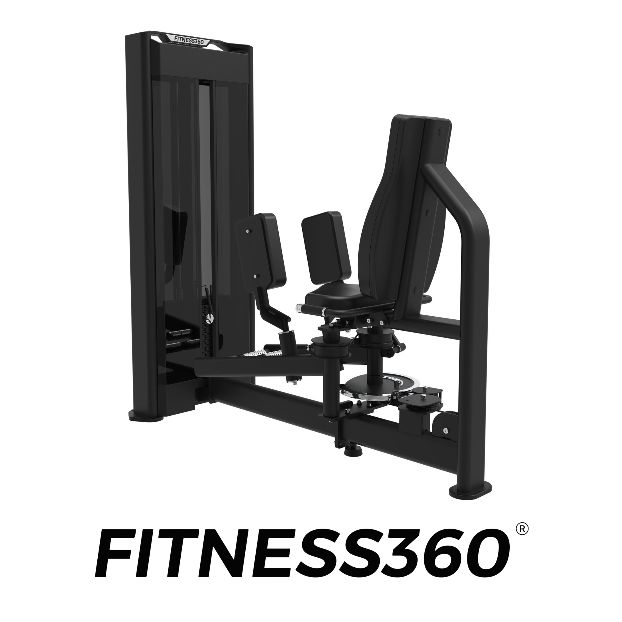 The seat and pads use robust, wear-resistant materials with heat-printed FITNESS360 branding. All grips and adjustment components feature black or chrome finishes, reinforcing the clean and minimalist design of the FITNESS360 pin-loaded range.