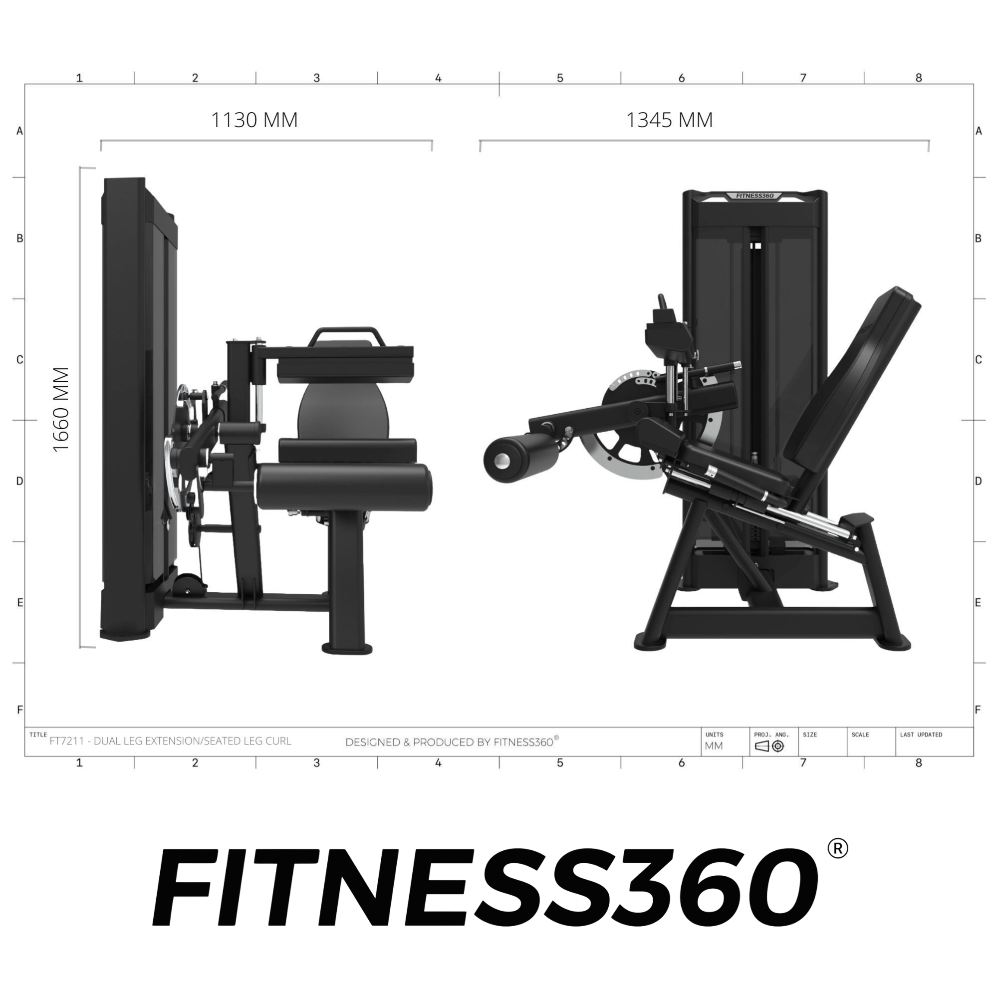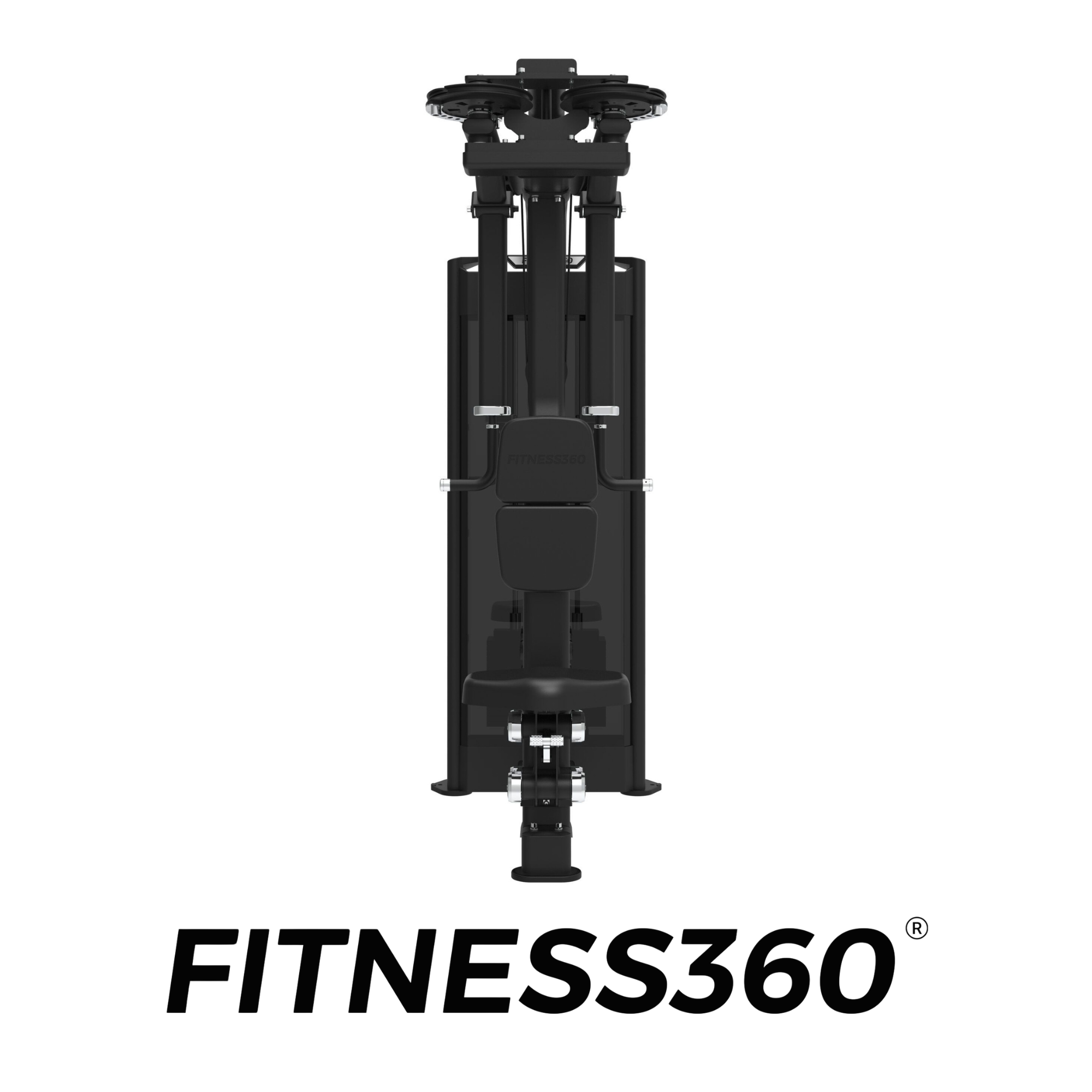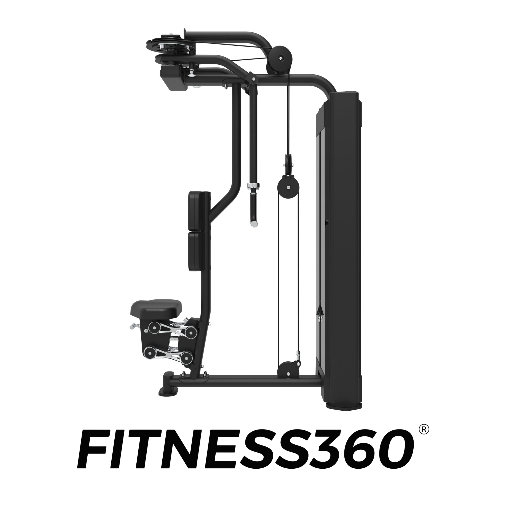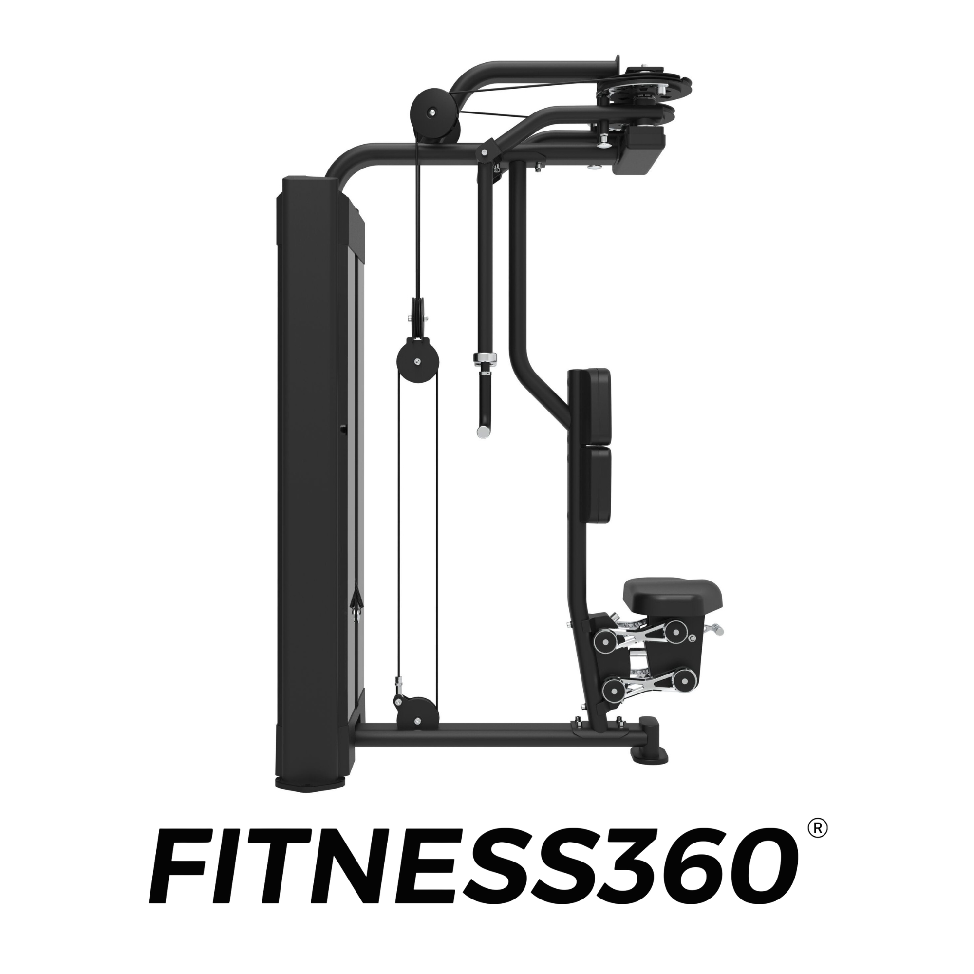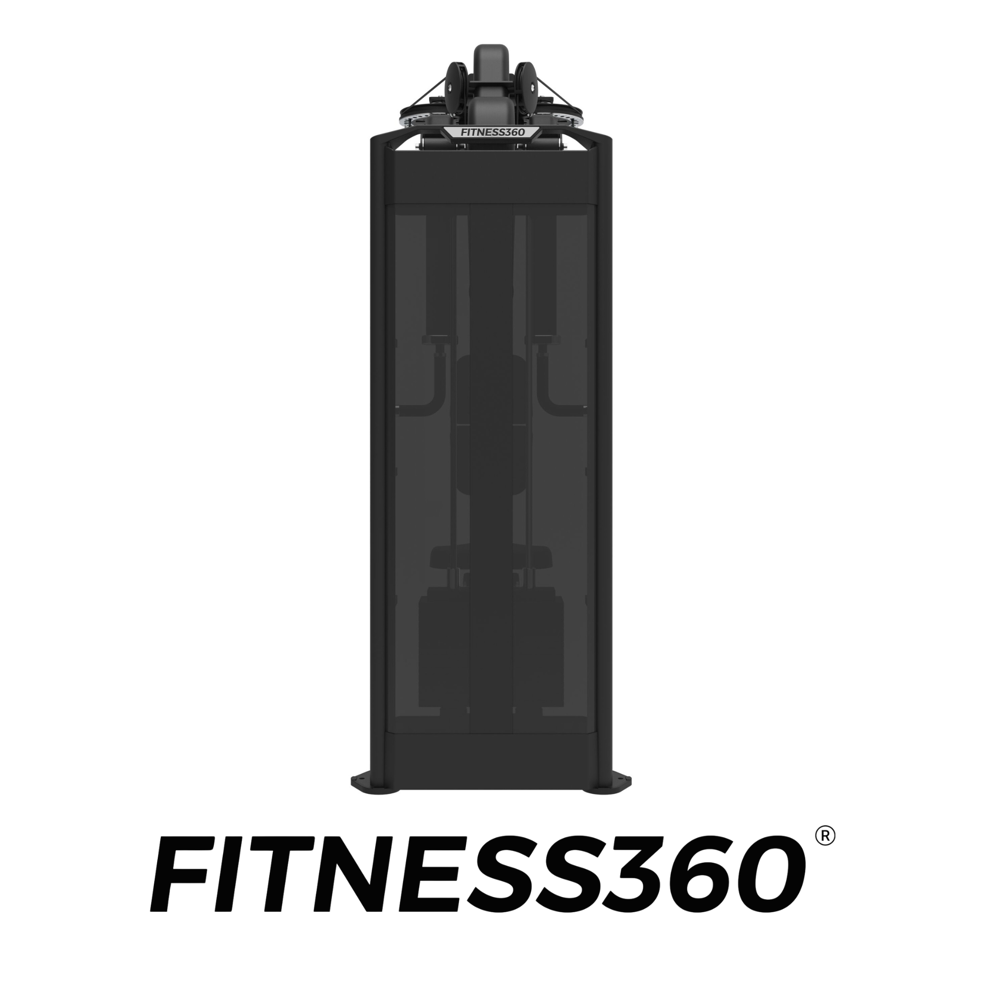 The seat and pads are made from robust, wear-resistant materials with heat-printed FITNESS360 branding. All grips and adjustment components feature black or chrome finishes, reinforcing the clean and minimalist design of the FITNESS360 pin-loaded range.