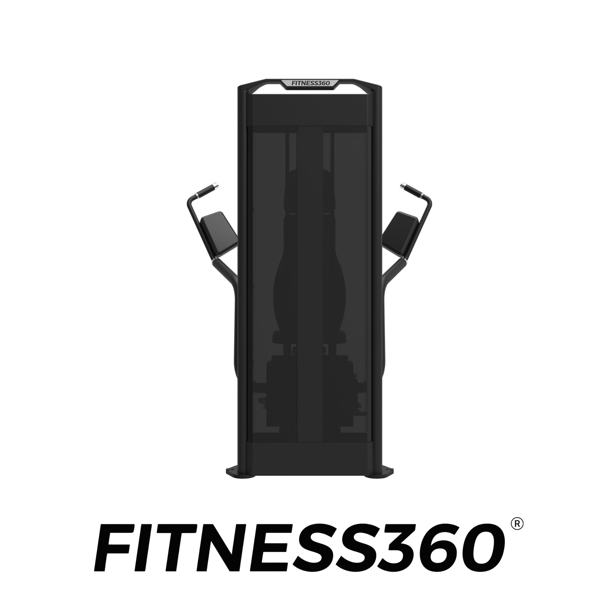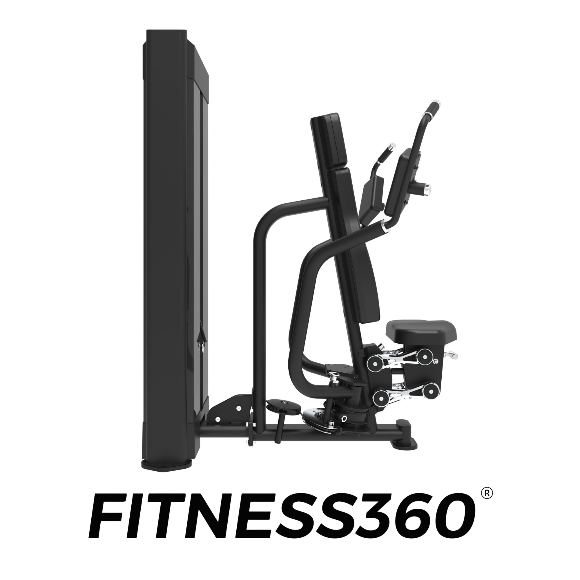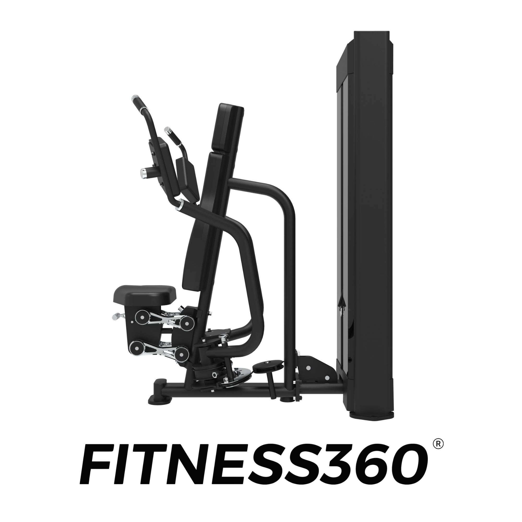 The seat and pads are made from robust, wear-resistant materials with heat-printed FITNESS360 branding. All grips and adjustment components feature black or chrome finishes, reinforcing the clean and minimalist design of the FITNESS360 pin-loaded range.