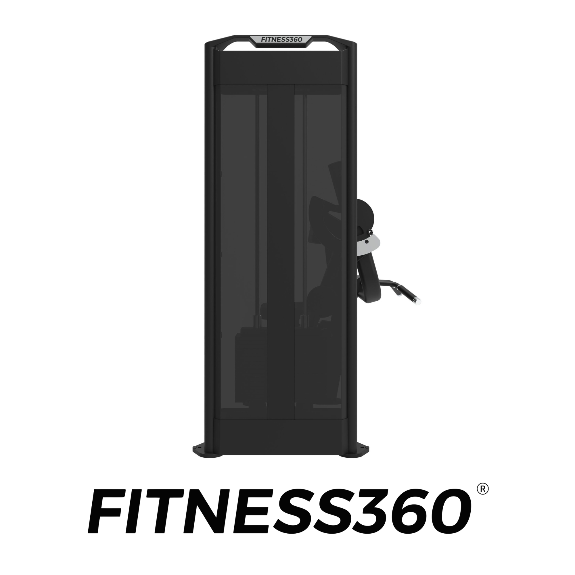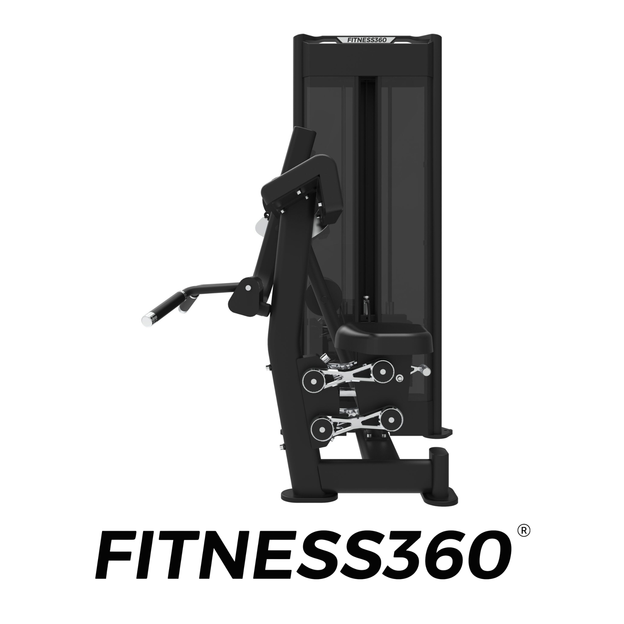 The seat and pads are made from robust, wear-resistant materials with heat-printed FITNESS360 branding. All grips and adjustment components feature black or chrome finishes, reinforcing the clean and minimalist design of the FITNESS360 pin-loaded range.
