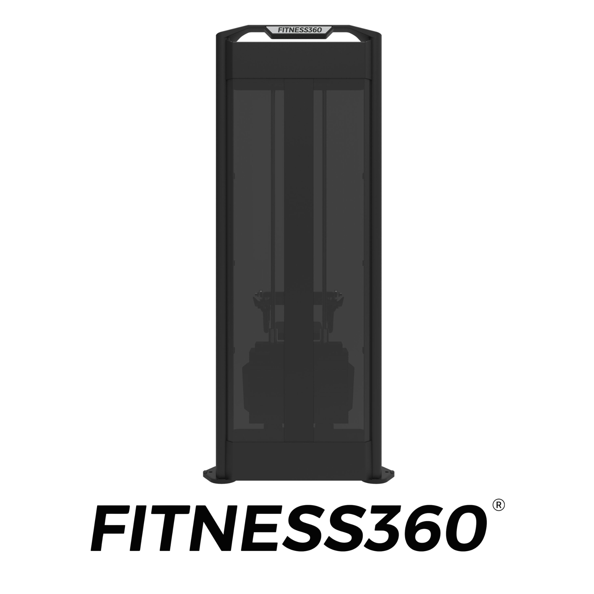 The frame is constructed from solid steel and finished with a laser-cut FITNESS360 logo on the weight magazine. All grips, adjustment levers, and components use black or chrome finishes, creating a clean and professional appearance.