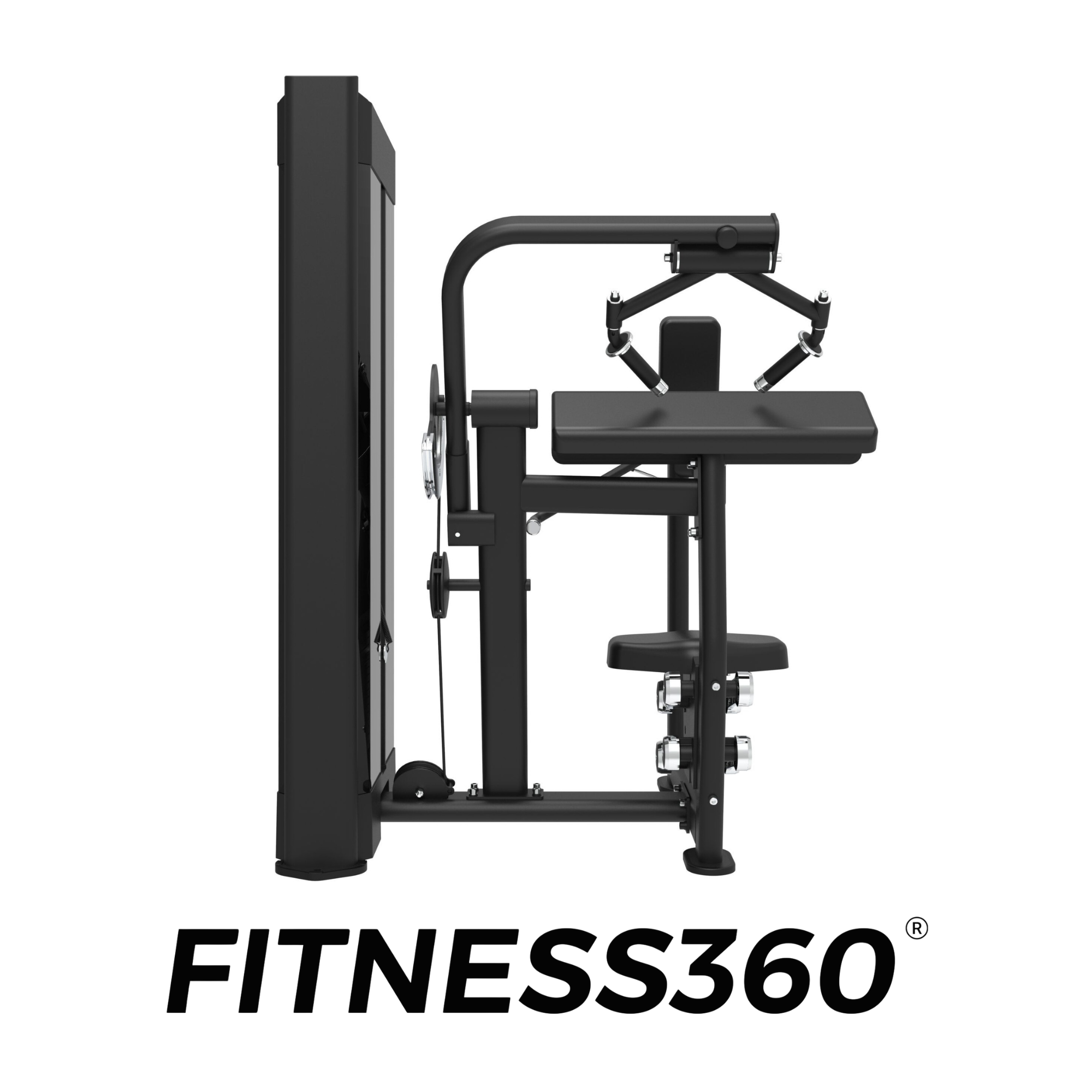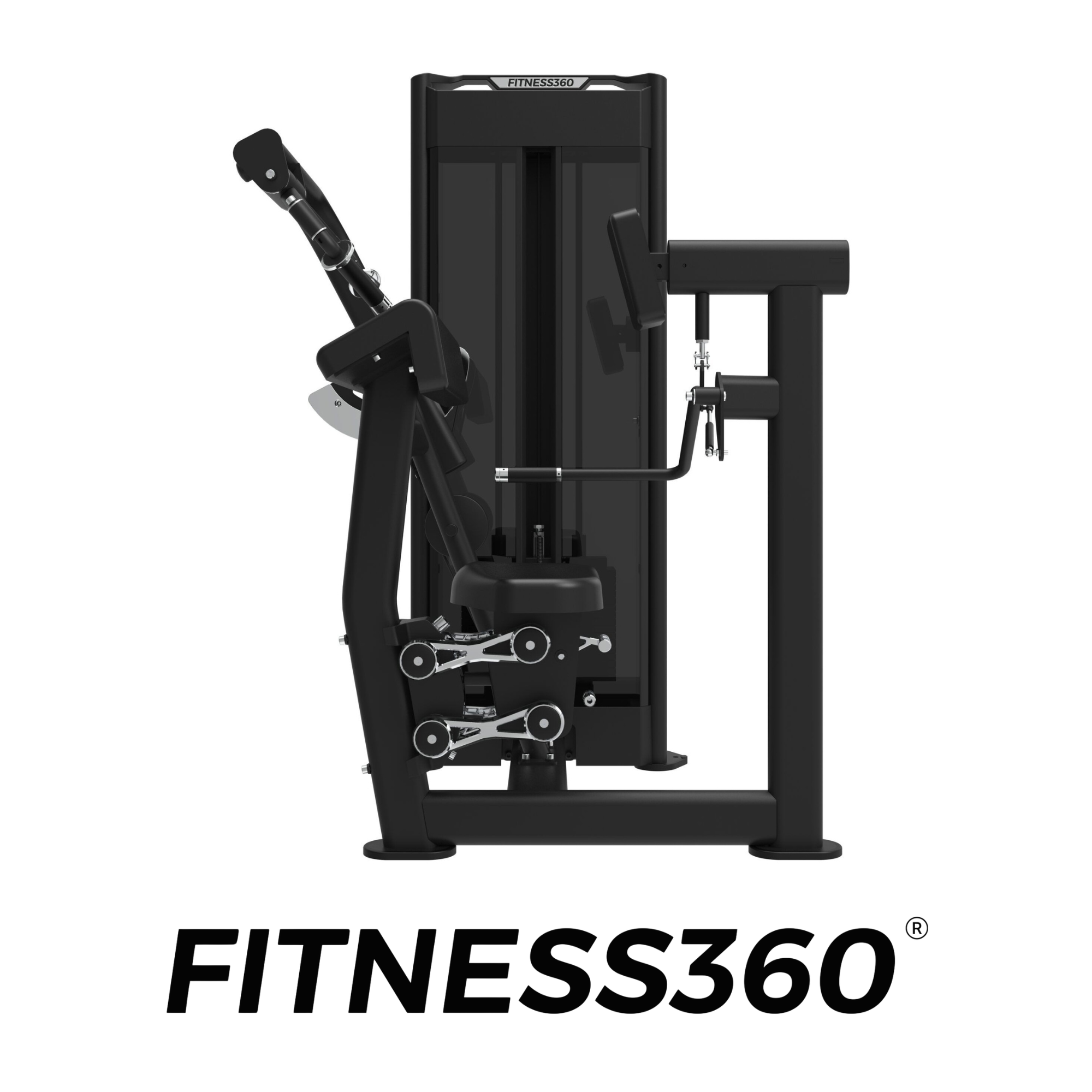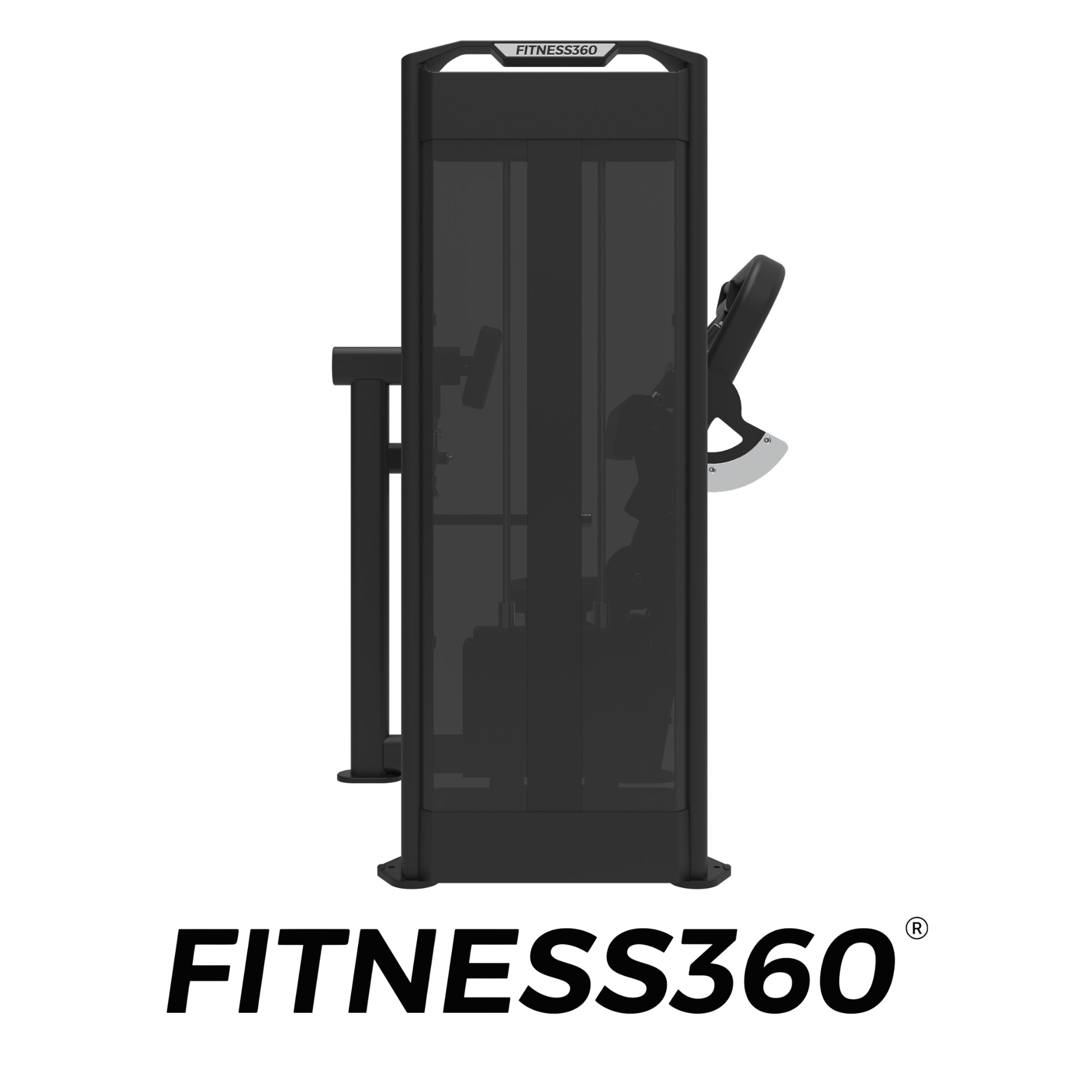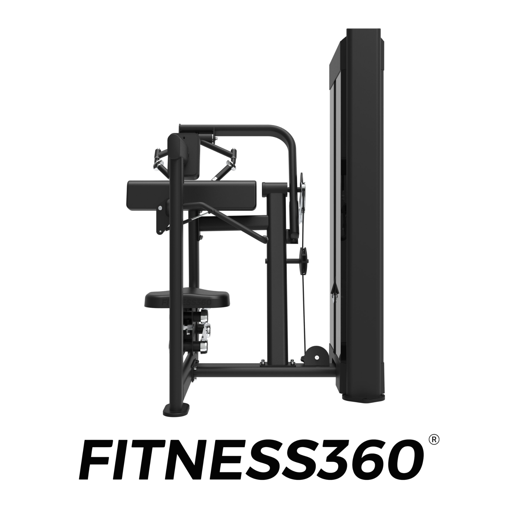 The frame is constructed from heavy-duty steel and finished with a laser-cut FITNESS360 logo on the weight magazine. All grips, adjustment levers, and components use black or chrome finishes, resulting in a clean and professional appearance.