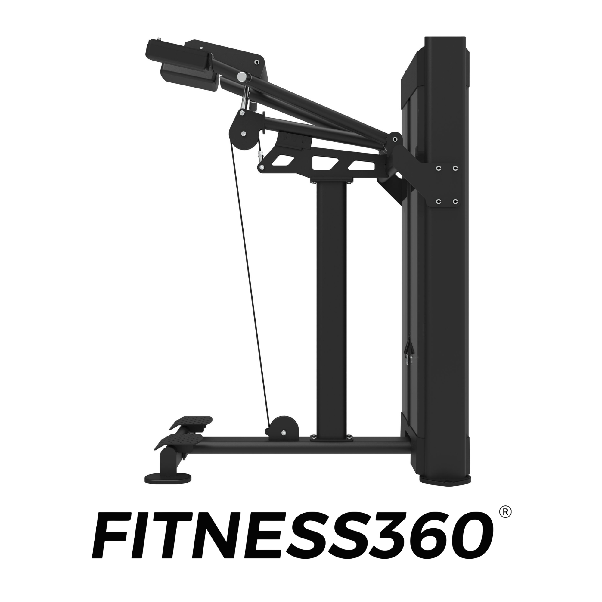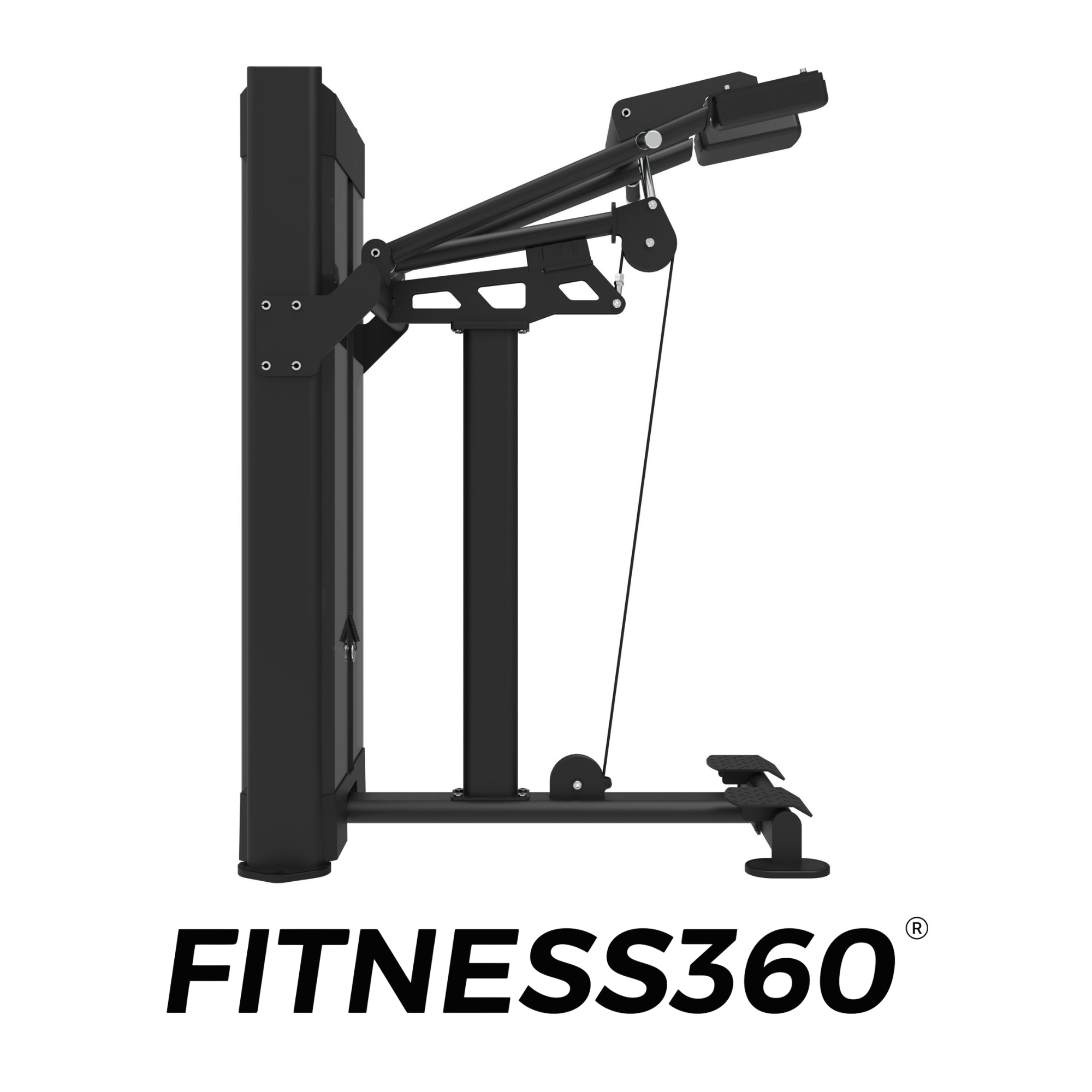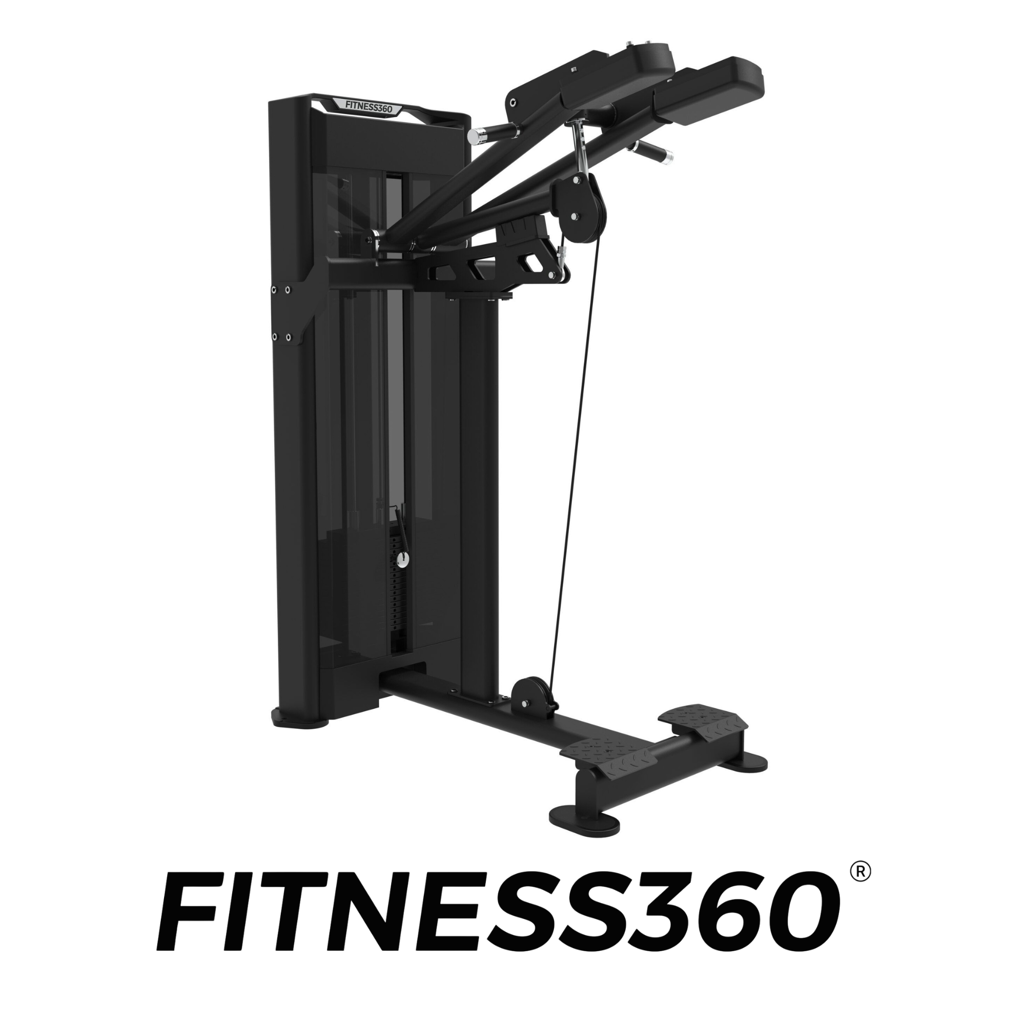 The upholstery consists of durable, wear-resistant material with heat-printed branding. Black and chrome details complete the minimalist, professional design that defines the FITNESS360 pin-loaded range.