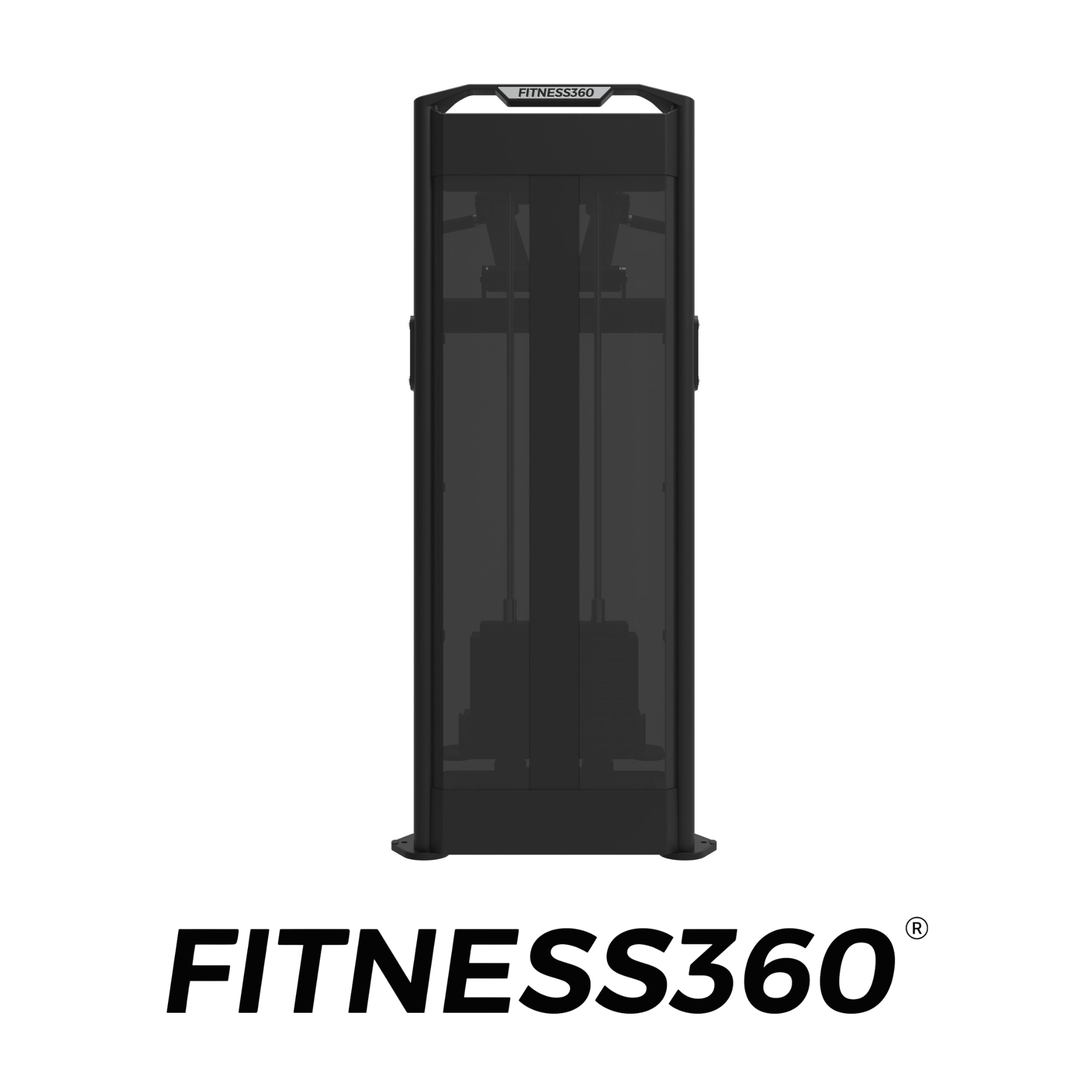 The machine integrates into a solid steel frame with a laser-cut FITNESS360 logo. A practical storage recess at the top of the weight stack allows users to place personal items during training.