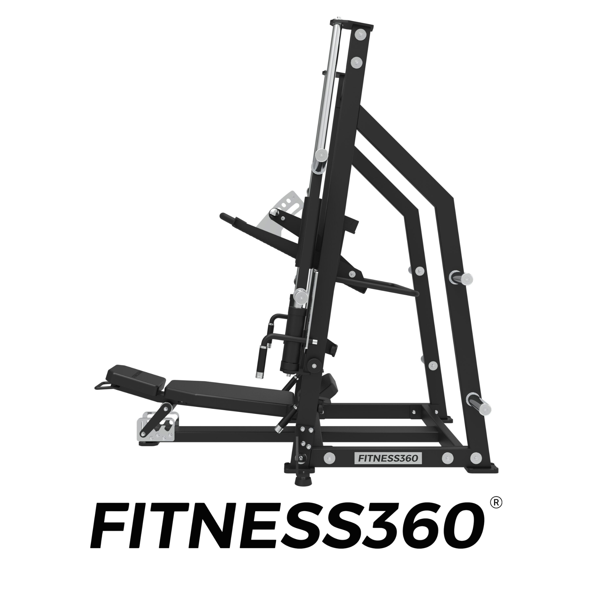 The frame consists of solid commercial-grade steel with a laser-cut FITNESS360 logo. All structural components are engineered for durability and heavy use in professional gym facilities.