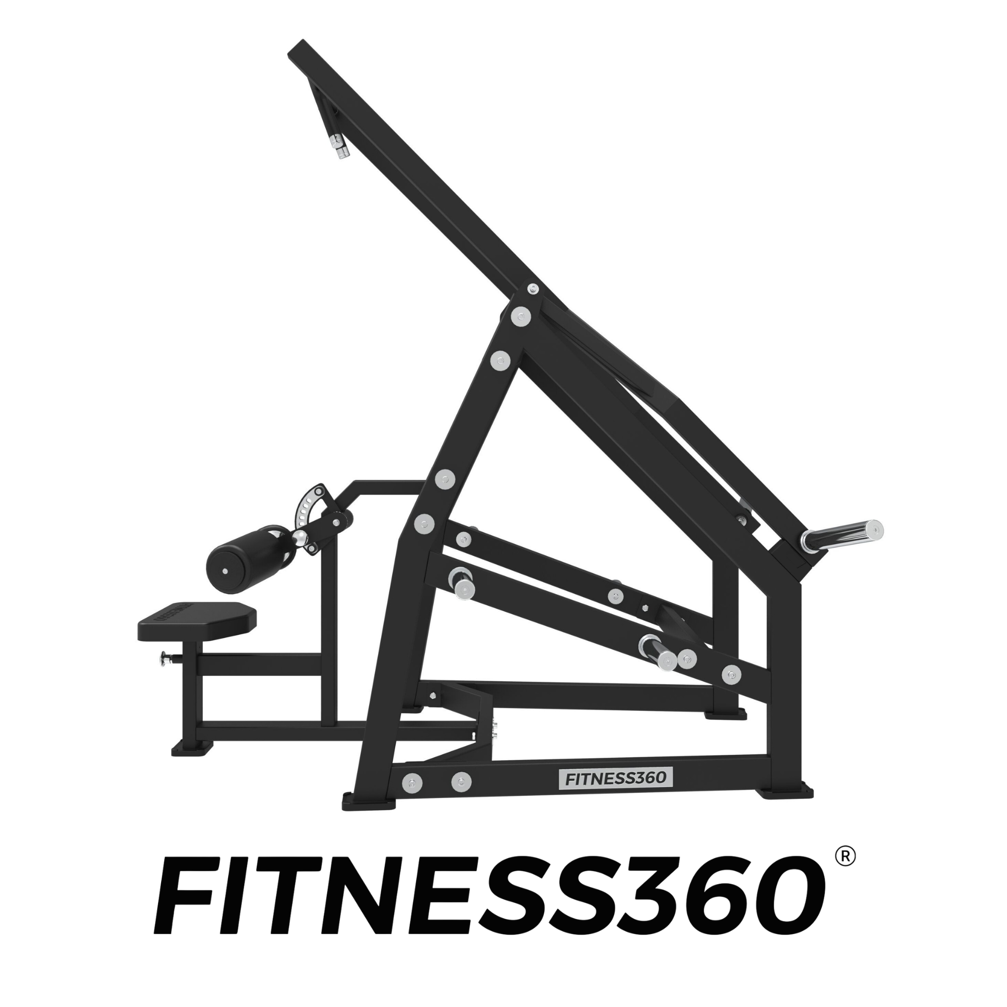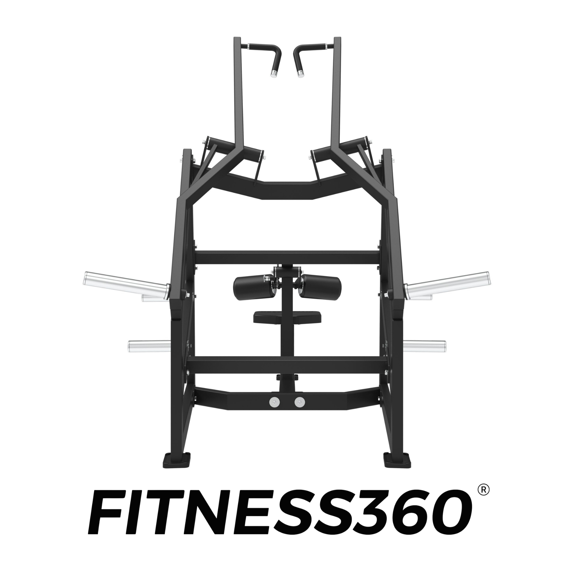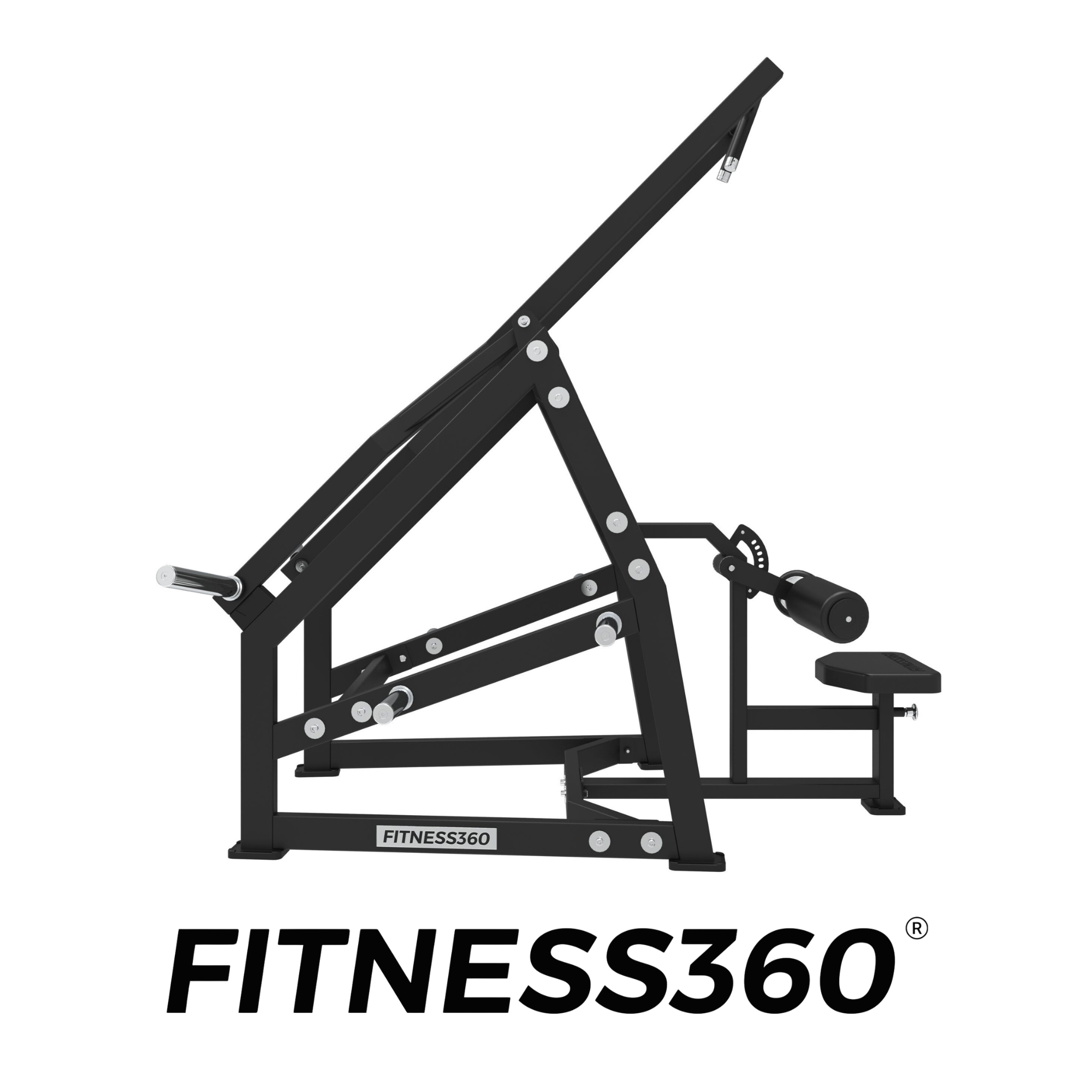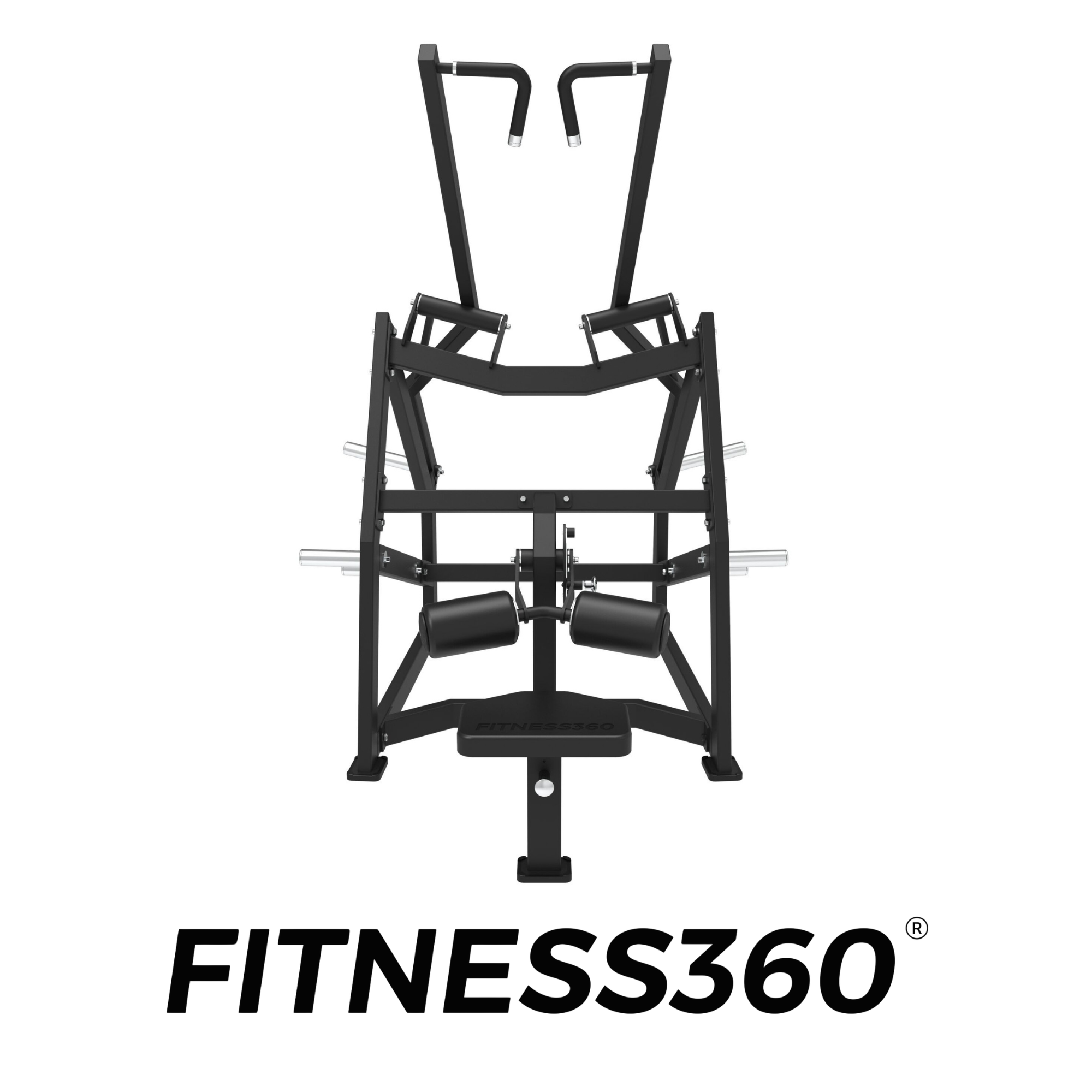 The frame consists of solid commercial-grade steel with a laser-cut FITNESS360 logo. All components are engineered for durability and stability in professional gym facilities.